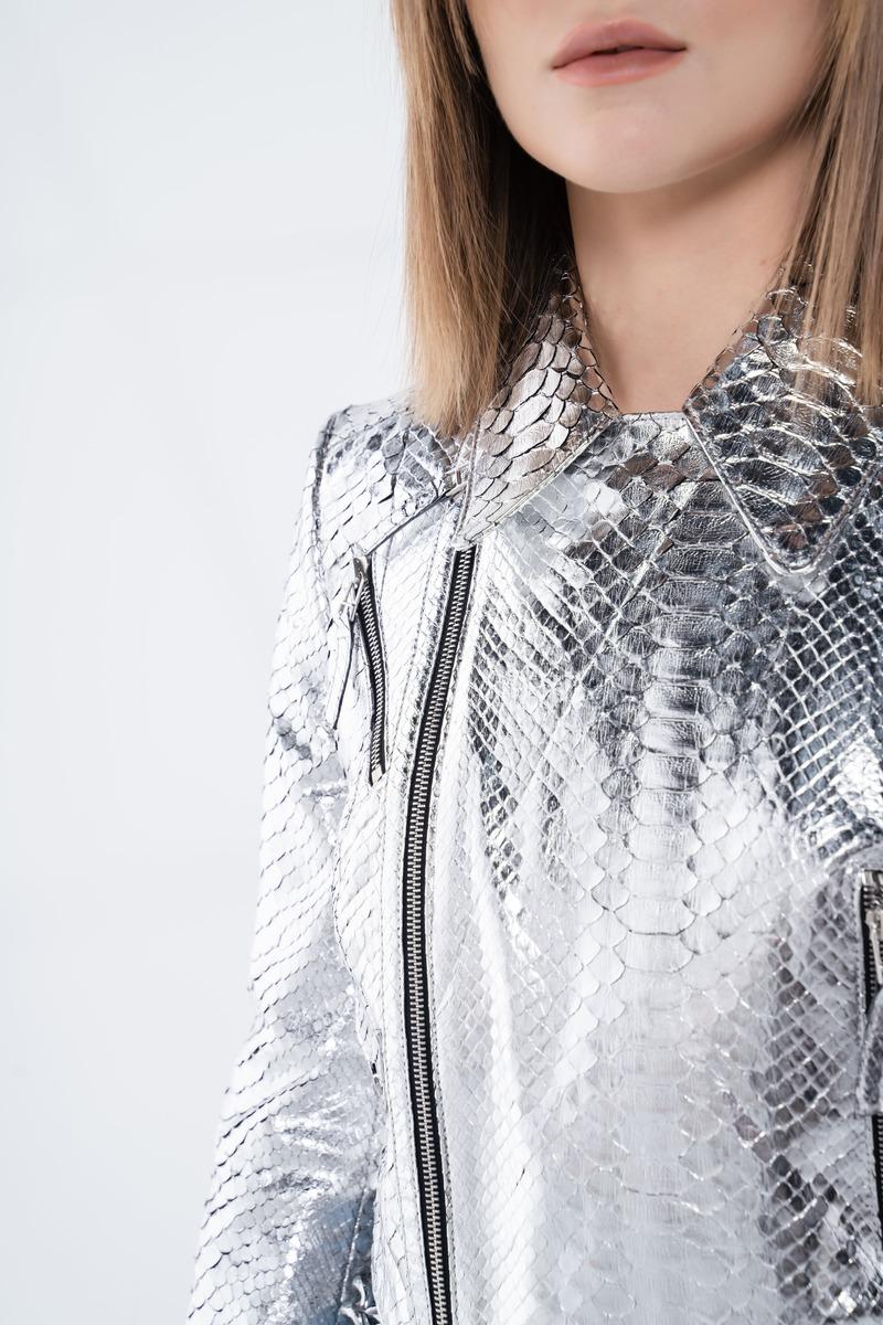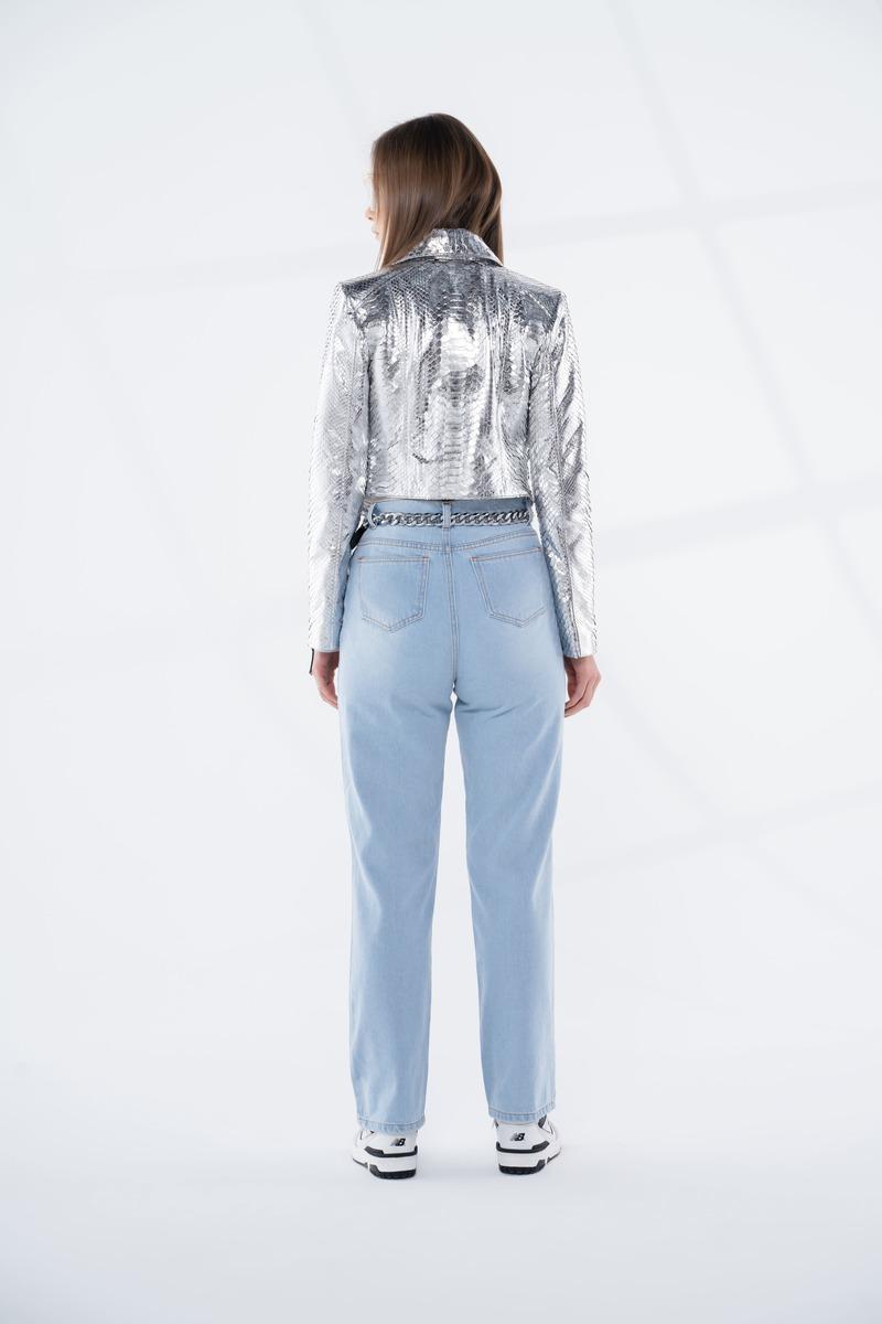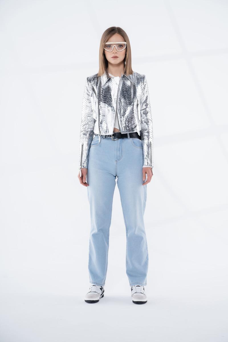 Gardırobunuza futuristik bir dokunuş katmak ister misiniz? Bu şık ve modern metalik gümüş renkli piton derisi ceket, cesur ve iddialı tarzınıza mükemmel uyum sağlar. Kaliteli piton derisinden üretilmiş ve metalik parlaklığıyla dikkat çeken bu ceket, her ortamda göz alıcı bir görünüm sunar.
